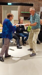 De dansers worden begeleid door vrijwilligers en dansen o.l.v. Frits Domburg.